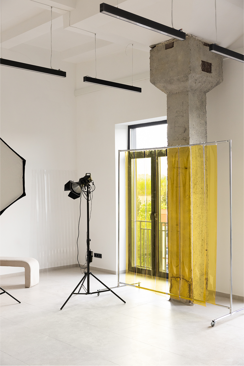 Endless Hall — це зала з архітектурним характером, де індустріальні матеріали зустрічаються з вишуканим швейцарським вінтажем. Циклорама, полікарбонат, ПВХ-стрічки та скляна цегла створюють сцену для експериментів зі світлом, лінією та простором. Ідеально для фешн-, арт- і продуктових зйомок.